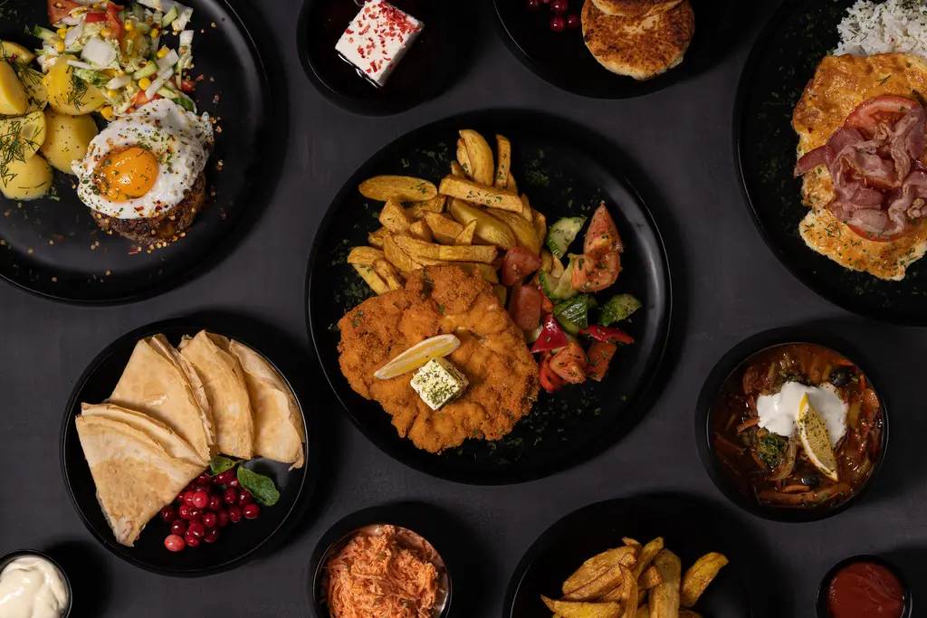 Vistas filejas karbonāde ar piedevām pēc izvēles un dārzeņu salātiem.